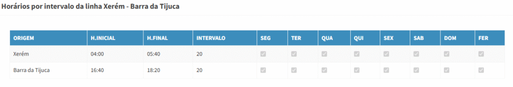 Elas também acusam a Vera Cruz e Santo Antônio de operar a linha com uma quantidade de horários maior do que o estabelecido. O DETRO estabeleceu que a linha deverá operar no pico da manhã no sentido Barra da Tijuca, e a tarde no sentido Xerém, com intervalos de 20 minutos, com partidas alternadas das duas empresas, conforme a imagem abaixo: