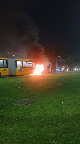 Um ônibus da MOBI-Rio, que gerencia o sistema de BRT da cidade, pegou fogo na noite desta segunda-feira, 23, na Avenida das Américas, próximo à Estação Pedra de Itaúna, na Barra da Tijuca, Zona Sudoeste do Rio.